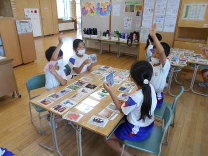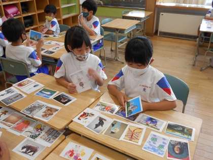 図画工作科で、アートカードを使った学習をしました。明るい感じや怖い感じのするカードを選んで紹介し合ったり、題名に合うカードを探したりしました。絵画だけでなく、建築物や彫刻等のカードもあるので、いろいろな面白さに触れることができました。