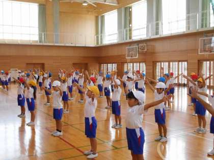 その後は、ラジオ体操の練習をしました。手をしっかり伸ばし、止めるところはピタッと止めていました。これまでの練習を思い出して、取り組んでいました。みんなで力を合わせてがんばりたいと思います。