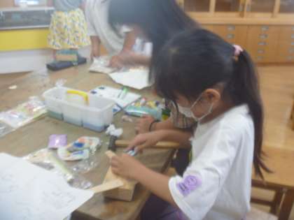 図工の時間に「くぎ打ちトントン」の学習を行っています。木材に色を塗ったり、木材に釘を打ったりしました。完成が楽しみです。