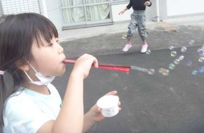 「もっともっと大きなしゃぼん玉はつくれないかな」「ミッキーの形のしゃぼん玉にするにはどうしたらよいのだろう」と前回の活動を振り返りながら、道具を工夫したり、上手なつくりかたをアドバイスしたりしました。