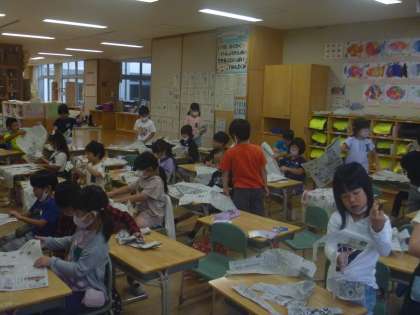 新聞紙を破いたり、ちぎったりしてできた形を見て、どんなものに見えるか想像を膨らませました。