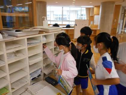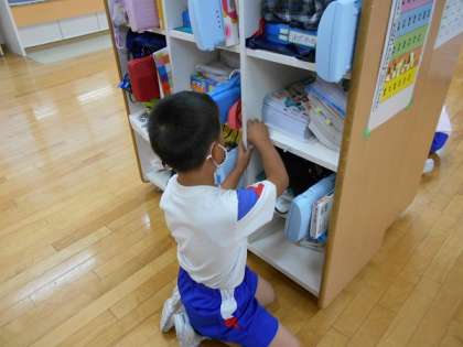三角定規の直角を使って、自分の身の回りから、角の形が直角になっているものを見つけました。教科書やノートはもちろん、ロッカーやネームプレート等、楽しく見つけていました。物回りには、意外に角が直角になっているものがあることに気付きました。