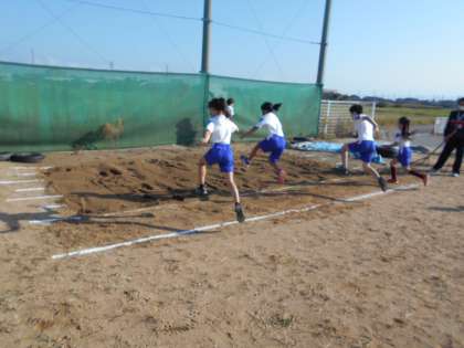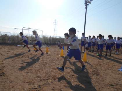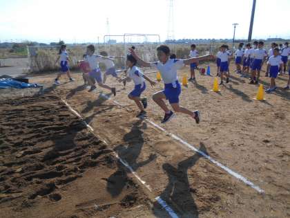 体育科の授業では、走り幅跳びに挑戦しています。跳びやすい踏み切りまでの距離を考えたり、「いち・にー・さーん」と声を出しながら跳んだりと、進んで学習に取り組む姿が見られました。