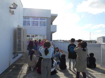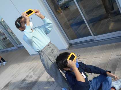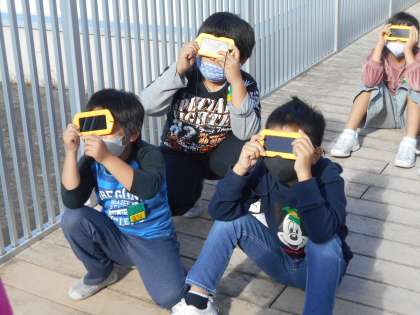 いつもならまぶしくてまともに見ることのかなわない太陽が、斜光プレート越しでは見ることができます。