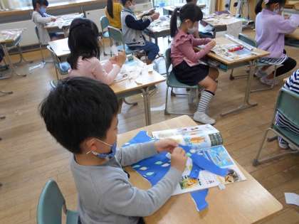 家から集めてきた包装紙を破いたり、ちぎったりしました。できた形から、何に見えるか想像することを楽しんでいました。活動が終わると、進んでごみを拾い、教室をきれいにしようとする子供たちがいて、素敵でした。