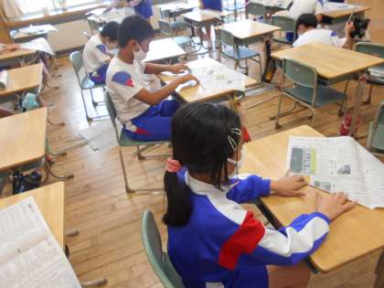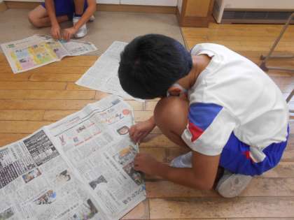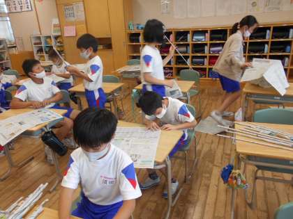 図画工作科「つなぐんぐん」では、新聞紙を繋げて立体的な作品を作ります。今日は、どのように新聞紙を巻いたら固く強い芯材になるのかを考えて活動しました。