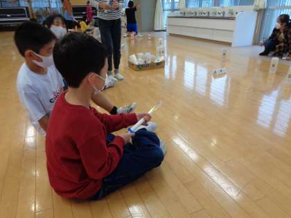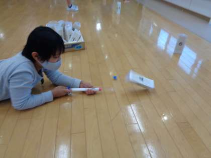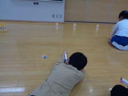 空気鉄砲を使った活動では、楽しみながら空気はおされると縮む(体積が小さくなる)ことを発見しました。