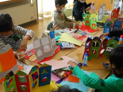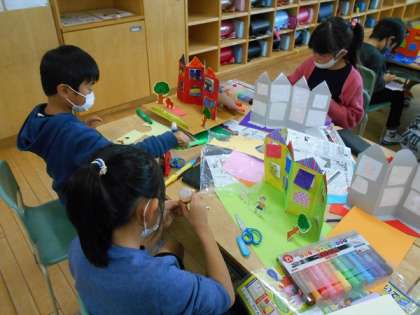 図画工作科「まどをひらいて」で、できあがった窓のある建物を台紙に立てました。建物の前に、実のなっている木や散歩する人等を作って立て、自分だけのすてきな町を作りました。