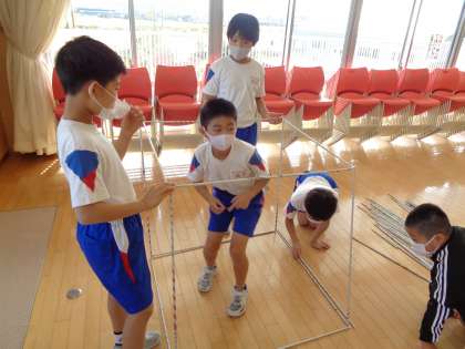 図画工作科「つなぐんぐん」の学習では、新聞紙を繋げて立体的な作品を作りました。三角形や四角形に繋いだ新聞紙を組み合わせたり、筒状にした新聞紙を積み重ねたりして立体的な作品を目指しました。