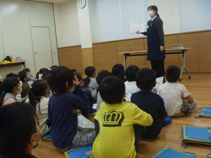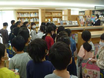 先生方が、図書館についてたくさんのことを教えてくださいました。説明をしていただき、図書館にいろいろなきまりがあることや、豊田分館に1万4千冊の本があることを知って、とても驚いていた子供たちでした。