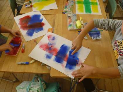 筆とは違った絵の具の色の付き方に、子供たちは楽しみながら活動していました。これからいくつかの行程を経て作品を完成させていきます!