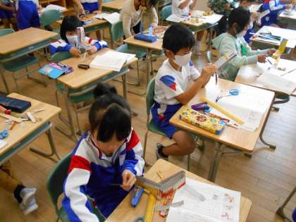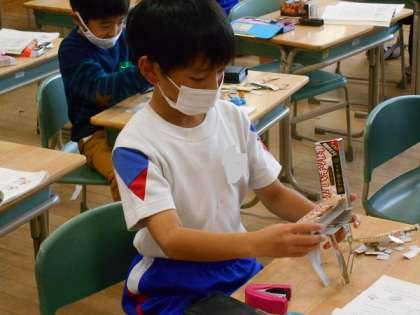説明文「馬のおもちゃの作り方」を読んで、馬のおもちゃを作りました。書いてある通りの長さに箱を切ったり、ホチキスで留めるところを写真で確かめたりしながら、作業を進めました。