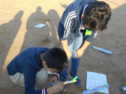 今日の理科の学習では、温度計を使って、日なたと日かげの地面の温度を一人一人測りました。