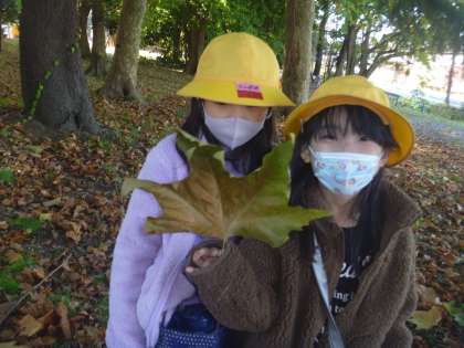 赤、黄、茶色、いろいろな種類の葉がありました。自分の顔と同じくらいの葉もありました。
