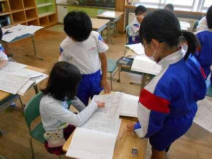 自分の書いた「おもちゃの作り方」の説明文を友達と読み合いました。「順序が分かる言葉が使ってあって、分かりやすい」「長さや数が書いてあるから、分かりやすい」など、文章の工夫を見付けてノートに書きました。