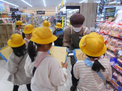 スーパーマーケット見学へ行ってきました。みんなが安心して買い物ができるような、お店の人たちの工夫がたくさん見つかりました。自分から進んで気になることを質問しました。写真は3組の様子です。