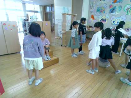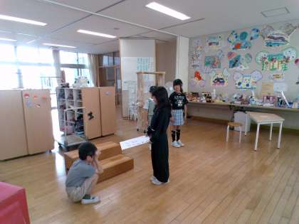 お手紙の音読発表会をしています。かえるくんやがまくんになりきってセリフを言ったり、振り付けをしたりしています。