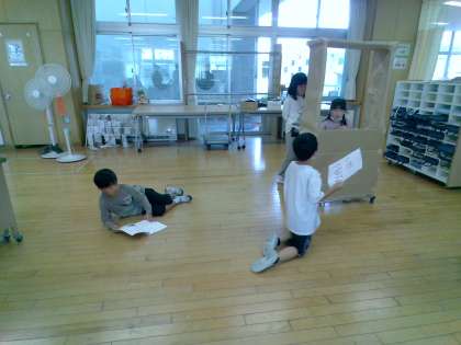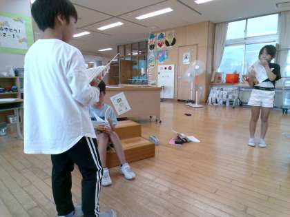 「お手紙」の音読発表会練習をしています。役に分かれて振り付けも考えています。