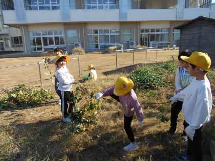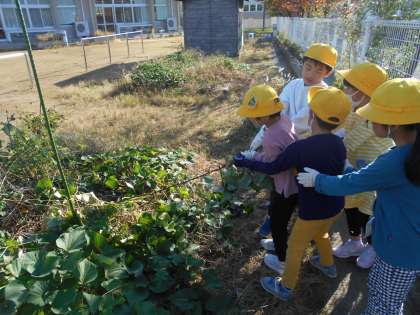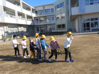 春に植えたサツマイモを収穫するために、今日はつるを刈りました。刈ったツルを見て「すごいながいね!」「いちばん長いのはどれかな」と長さ比べをしたり、「長いから電車になるよ」と電車ごっこをして遊んだり、遊びながら学んでいる子供たちでした。