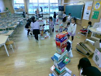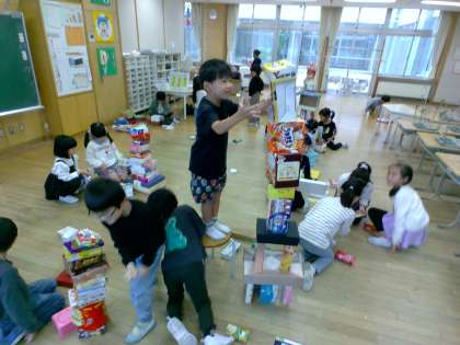 「かたちあそび」をしました。一人で挑戦する人や仲間と協力する人がおり、様々な形の箱を使って自分たちのイメージに向けてつくっています。高くするために、下には大きな箱を使い、上にいくほど小さな箱にするなどの工夫をしています。