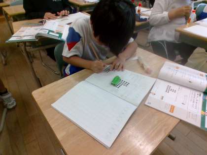 かけ算の学習を生かして、学習しています。いくつの丸があるかをかけ算と足し算を利用して、数のまとまりに気を付けながら数えています。