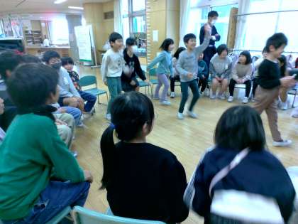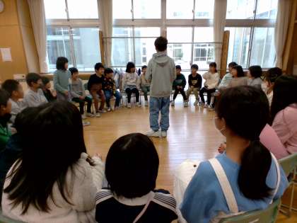 豊田っ子タイムの時間に他学年の友達と交流しました。5の4では、2の4と「生活フルーツバスケット」をしました。性別や服の色など見た目でわかることではなく、好きな食べ物や教科など、お互いのことがわかるような内容で行いました。