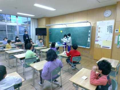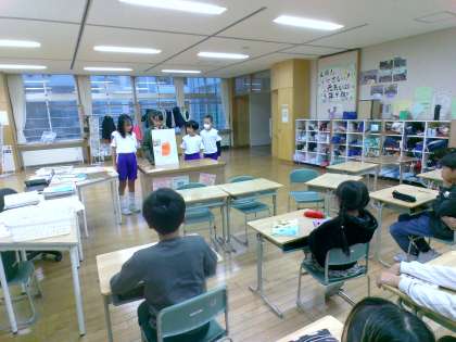 今日は自分たちの取組をちがうクラスの友達にも広めるためのお知らせに行きました。