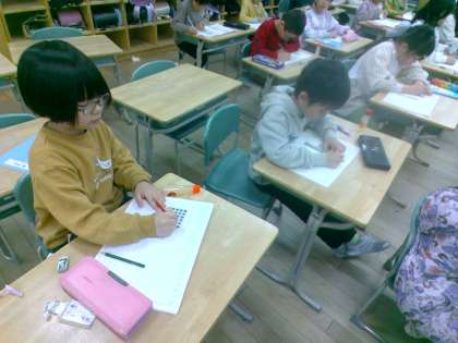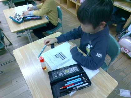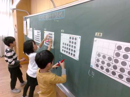 算数科では、かけ算で学習した知識を使って、ドット図の数を数えています。図から数のまとまりを見つけて式を立てて答えを求めたり、自分の考えを友達に説明したりしています。