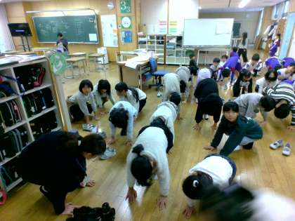 5年生が、体を柔らかくする方法を教えてくれました。3年生の体力アップにつながるとよいですね!