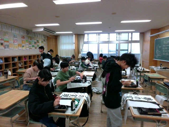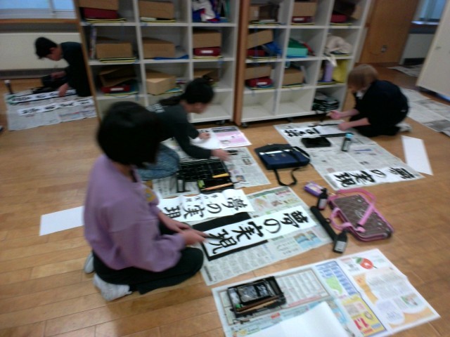 書初大会の6年生の様子です。今まで学習してきたことを活かして、今年の抱負を抱きながら1画1画心を込めて書き切りました。