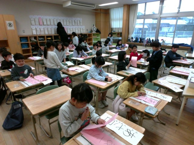 三学期の始業式を終えて、各教室で書初大会をしました。「冬休み中に頑張ったように、お手本のように書く」や「金賞取れるように集中して書きたい」などそれぞれが目当てをもって集中して書いていました。