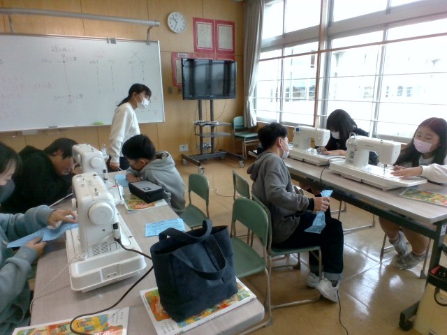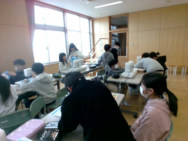 ミシンの基本の縫い方を練習しています。下糸と上糸のかけかたに苦戦しながらも、まっすぐ縫ったり、返し縫いをして頑丈に縫ったりするなど、グループの友達と協力していました。