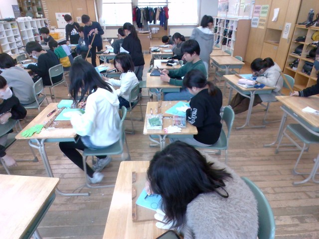 4年生は自分のお気に入りの動物を版画で表しています。線彫りと面彫りを使い分けながら彫り進めています。