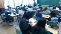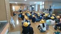 避難訓練の様子です。給食センターで火災が起きた場合、どのようにすればよいか考えました。