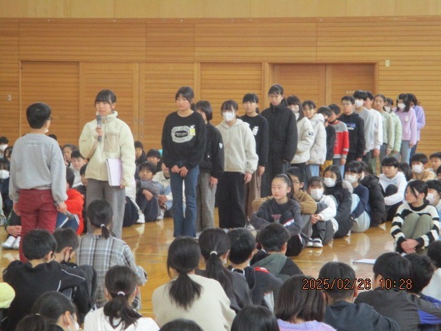 4、5、6年生が集まり、来年度を担う豊田っ子たちに児童会引き継ぎ式を行いました。