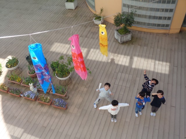 わかば級のみんなが、うろこに絵を描いてこいのぼりをつくりました。