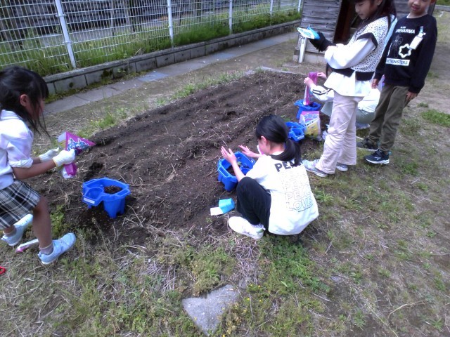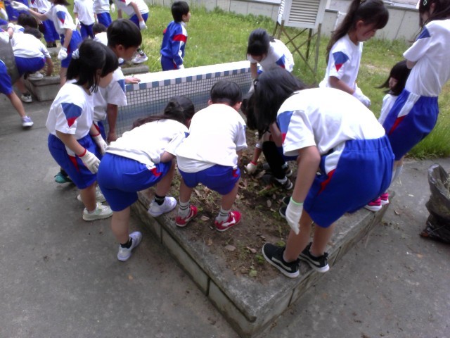 2年生では、野菜作りに向けて草むしりをしたり、苗を畑や鉢に植えたりしました。大きく育ってほしいという思いをもって、大切に環境を整備していました。