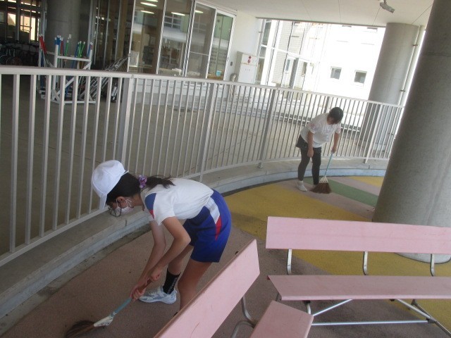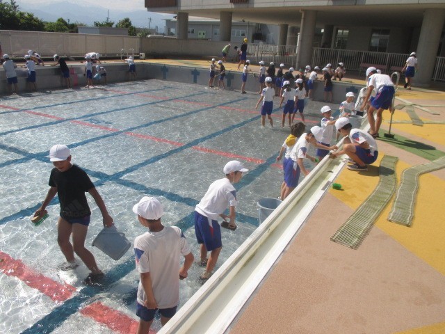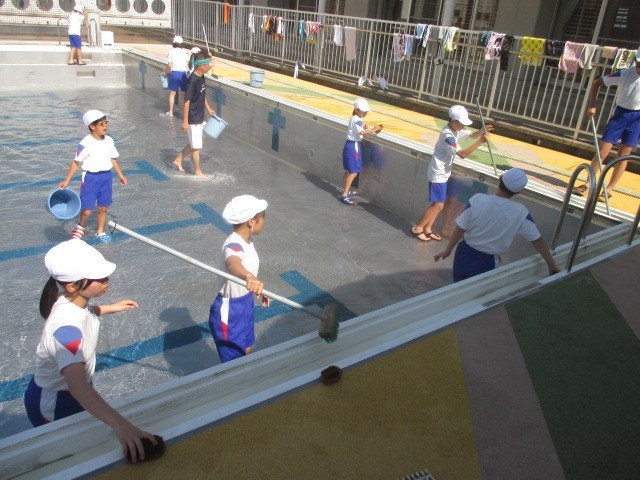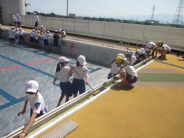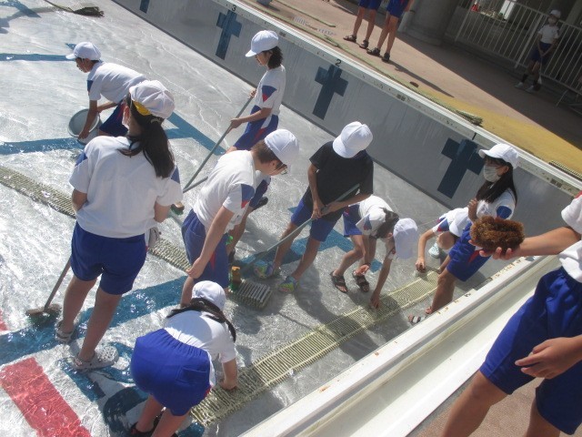 プール清掃前半は2組と4組が側溝をメインに掃除しました。