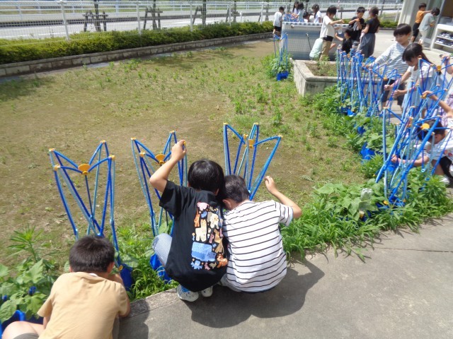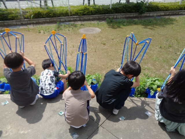 たくさん育ってきたあさがおさんにもっと育ってほしいと支柱を立てました。