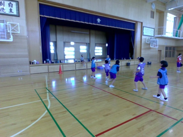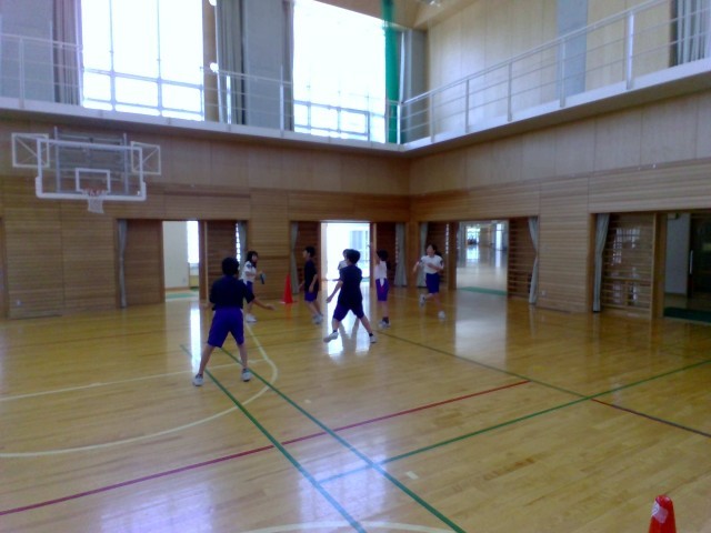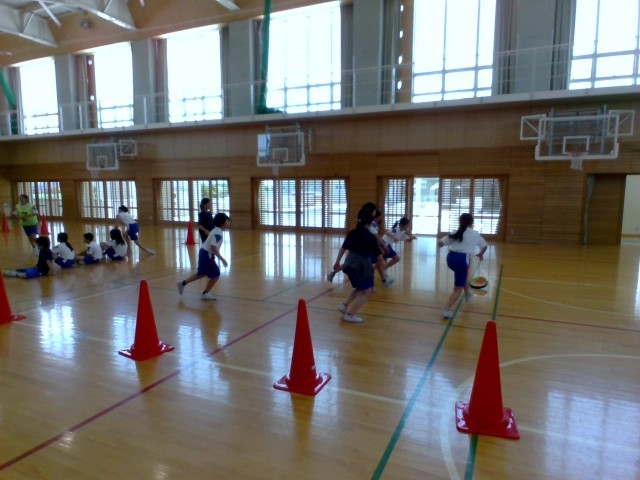 体育科では「アルティメット」をしています。得点を取るためにどうしたらよいかチームで話し合い、何度も練習しています。