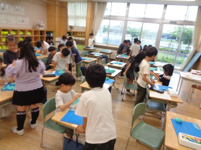 粘土で作ったご馳走の作品を鑑賞しました。友達の作品を見ながら子供同士でよさを見付けていました。