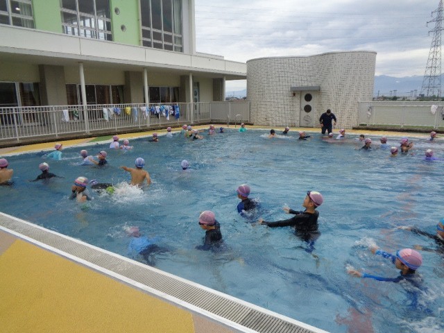 プール開きをしました。曇り空で少し肌寒かったようですが、気持ちよく楽しい時間を過ごしていました。