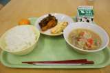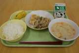 今日の献立は、ご飯、魚の竜田揚げ、そえ野菜、筑前だき、牛乳です。