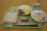 今日の献立は、食パン、クリーム煮、オムレツ、ビーンズサラダ、メープルジャム(小袋...