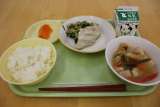 今日の献立は、ご飯、さわらの塩焼き、磯和え、大根と厚揚げの中華煮、甘平(柑橘類...