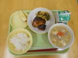 今日の献立は、ご飯、豚汁、青梗菜ソテー、鯖の照り焼き、リンゴ、牛乳です。