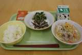 今日の献立は、ご飯、小あじの唐揚げ、菜花ひたし、白ごま豆乳うどん、穀物ふりかけ...