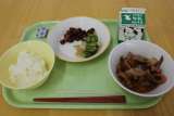 今日の献立は、ご飯、いかと里芋の煮物、梅フライビーンズ、昆布和え、ポケットチー...