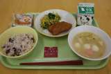 今日の献立は、赤飯、とんかつ、コーン和え、紅白白玉汁、豆乳プリンタルト、牛乳で...