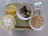 今日の献立は、ご飯、牛乳、アジのみりん焼き、チンゲンサイソテー、豚汁、バナナです...